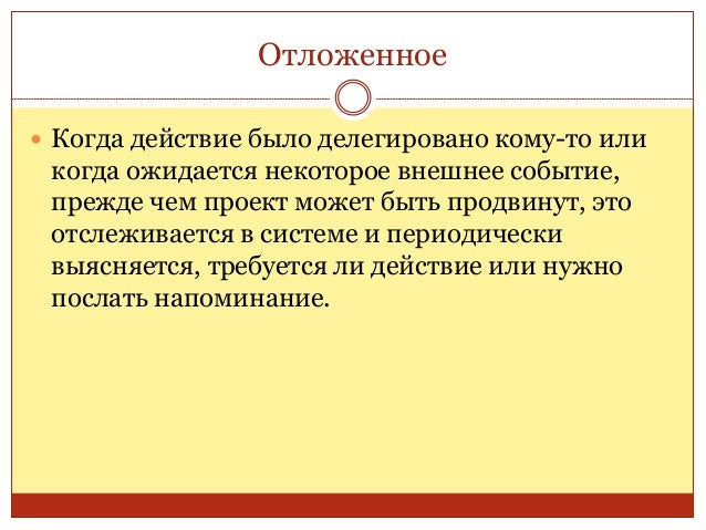 31. 31. Отложенное  Когда действие было делегировано кому-то или когда ожидается некоторое внешнее событие, прежде чем проект может быть продвинут, это отслеживается в системе и периодически выясняется, требуется ли действие или нужно послать напоминание.