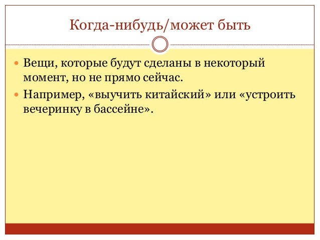 32. 32. Когда-нибудь/может быть  Вещи, которые будут сделаны в некоторый момент, но не прямо сейчас.  Например, «выучить китайский» или «устроить вечеринку в бассейне».