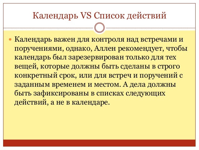 33. 33. Календарь VS Список действий  Календарь важен для контроля над встречами и поручениями, однако, Аллен рекомендует, чтобы календарь был зарезервирован только для тех вещей, которые должны быть сделаны в строго конкретный срок, или для встреч и поручений с заданным временем и местом. А дела должны быть зафиксированы в списках следующих действий, а не в календаре.