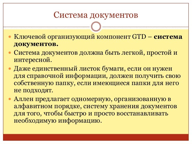 34. 34. Система документов  Ключевой организующий компонент GTD – система документов.  Система документов должна быть легкой, простой и интересной.  Даже единственный листок бумаги, если он нужен для справочной информации, должен получить свою собственную папку, если имеющиеся папки для него не подходят.  Аллен предлагает одномерную, организованную в алфавитном порядке, систему хранения документов для того, чтобы быстро и просто восстанавливать необходимую информацию.