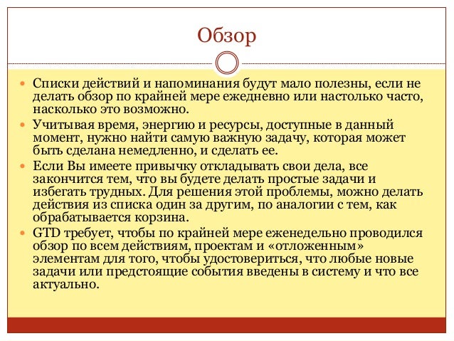 35. 35. Обзор  Списки действий и напоминания будут мало полезны, если не делать обзор по крайней мере ежедневно или настолько часто, насколько это возможно.  Учитывая время, энергию и ресурсы, доступные в данный момент, нужно найти самую важную задачу, которая может быть сделана немедленно, и сделать ее.  Если Вы имеете привычку откладывать свои дела, все закончится тем, что вы будете делать простые задачи и избегать трудных. Для решения этой проблемы, можно делать действия из списка один за другим, по аналогии с тем, как обрабатывается корзина.  GTD требует, чтобы по крайней мере еженедельно проводился обзор по всем действиям, проектам и «отложенным» элементам для того, чтобы удостовериться, что любые новые задачи или предстоящие события введены в систему и что все актуально.
