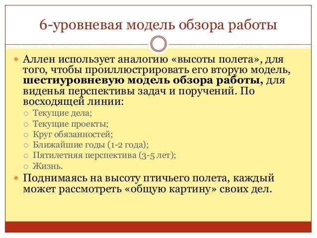 37. 37. 6-уровневая модель обзора работы  Аллен использует аналогию «высоты полета», для того, чтобы проиллюстрировать его вторую модель, шестиуровневую модель обзора работы, для виденья перспективы задач и поручений. По восходящей линии:  Текущие дела;  Текущие проекты;  Круг обязанностей;  Ближайшие годы (1-2 года);  Пятилетняя перспектива (3-5 лет);  Жизнь.  Поднимаясь на высоту птичьего полета, каждый может рассмотреть «общую картину» своих дел.