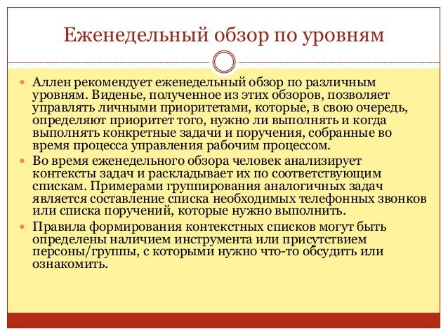 38. 38. Еженедельный обзор по уровням  Аллен рекомендует еженедельный обзор по различным уровням. Виденье, полученное из этих обзоров, позволяет управлять личными приоритетами, которые, в свою очередь, определяют приоритет того, нужно ли выполнять и когда выполнять конкретные задачи и поручения, собранные во время процесса управления рабочим процессом.  Во время еженедельного обзора человек анализирует контексты задач и раскладывает их по соответствующим спискам. Примерами группирования аналогичных задач является составление списка необходимых телефонных звонков или списка поручений, которые нужно выполнить.  Правила формирования контекстных списков могут быть определены наличием инструмента или присутствием персоны/группы, с которыми нужно что-то обсудить или ознакомить.