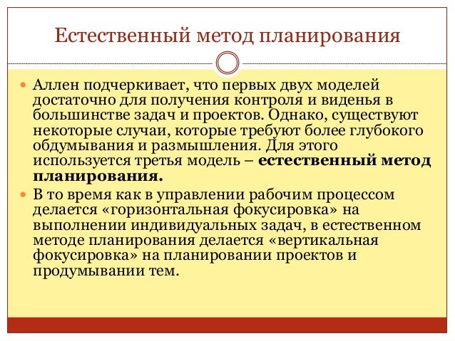 39. 39. Естественный метод планирования  Аллен подчеркивает, что первых двух моделей достаточно для получения контроля и виденья в большинстве задач и проектов. Однако, существуют некоторые случаи, которые требуют более глубокого обдумывания и размышления. Для этого используется третья модель – естественный метод планирования.  В то время как в управлении рабочим процессом делается «горизонтальная фокусировка» на выполнении индивидуальных задач, в естественном методе планирования делается «вертикальная фокусировка» на планировании проектов и продумывании тем.