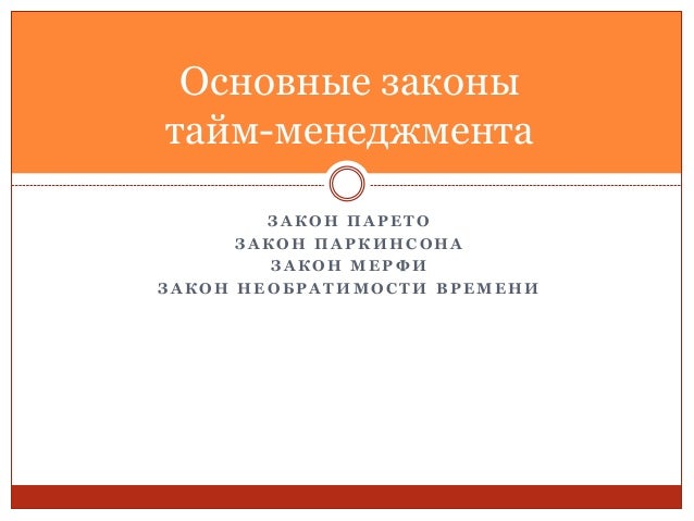 4. 4. З А К О Н П А Р Е Т О З А К О Н П А Р К И Н С О Н А З А К О Н М Е Р Ф И З А К О Н Н Е О Б Р А Т И М О С Т И В Р Е М Е Н И Основные законы тайм-менеджмента