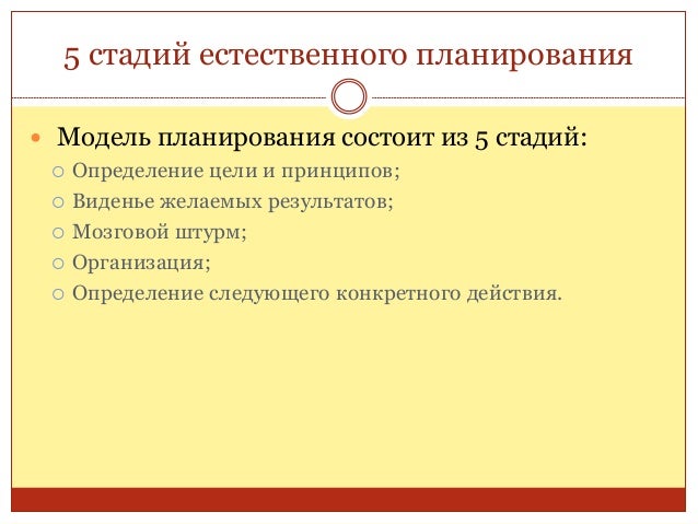 40. 40. 5 стадий естественного планирования  Модель планирования состоит из 5 стадий:  Определение цели и принципов;  Виденье желаемых результатов;  Мозговой штурм;  Организация;  Определение следующего конкретного действия.