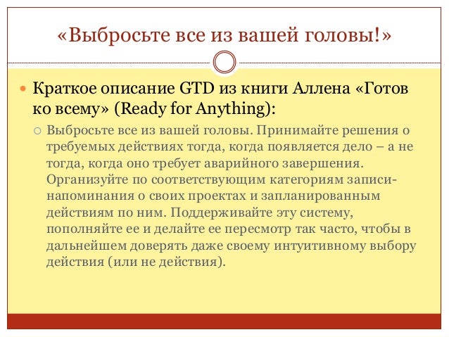 42. 42. «Выбросьте все из вашей головы!»  Краткое описание GTD из книги Аллена «Готов ко всему» (Ready for Anything):  Выбросьте все из вашей головы. Принимайте решения о требуемых действиях тогда, когда появляется дело – а не тогда, когда оно требует аварийного завершения. Организуйте по соответствующим категориям записи- напоминания о своих проектах и запланированным действиям по ним. Поддерживайте эту систему, пополняйте ее и делайте ее пересмотр так часто, чтобы в дальнейшем доверять даже своему интуитивному выбору действия (или не действия).