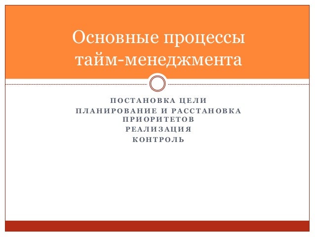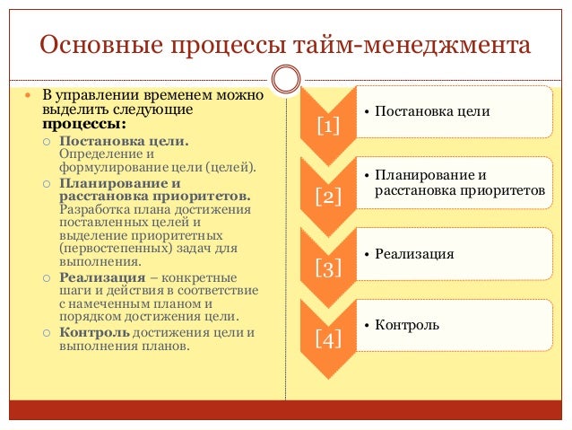 44. 44. Основные процессы тайм-менеджмента  В управлении временем можно выделить следующие процессы:  Постановка цели. Определение и формулирование цели (целей).  Планирование и расстановка приоритетов. Разработка плана достижения поставленных целей и выделение приоритетных (первостепенных) задач для выполнения.  Реализация – конкретные шаги и действия в соответствие с намеченным планом и порядком достижения цели.  Контроль достижения цели и выполнения планов. [1] • Постановка цели [2] • Планирование и расстановка приоритетов [3] • Реализация [4] • Контроль