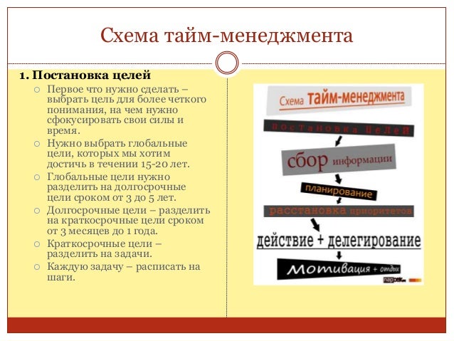 45. 45. Схема тайм-менеджмента 1. Постановка целей  Первое что нужно сделать – выбрать цель для более четкого понимания, на чем нужно сфокусировать свои силы и время.  Нужно выбрать глобальные цели, которых мы хотим достичь в течении 15-20 лет.  Глобальные цели нужно разделить на долгосрочные цели сроком от 3 до 5 лет.  Долгосрочные цели – разделить на краткосрочные цели сроком от 3 месяцев до 1 года.  Краткосрочные цели – разделить на задачи.  Каждую задачу – расписать на шаги.