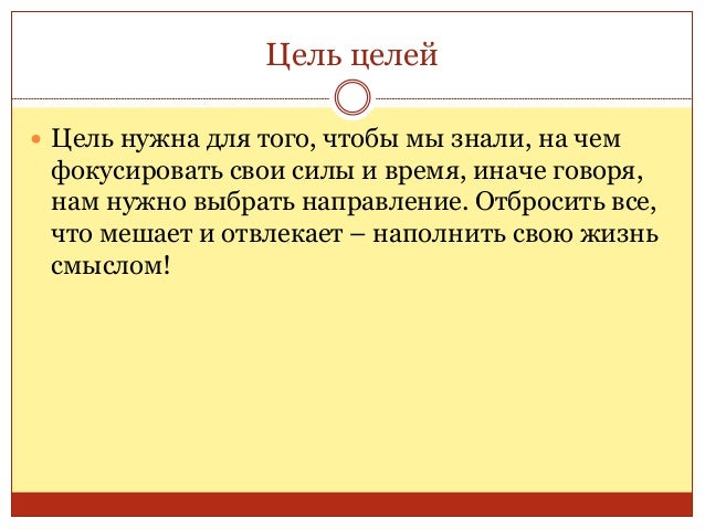 48. 48. Цель целей  Цель нужна для того, чтобы мы знали, на чем фокусировать свои силы и время, иначе говоря, нам нужно выбрать направление. Отбросить все, что мешает и отвлекает – наполнить свою жизнь смыслом!