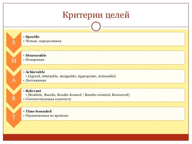 51. 51. Критерии целей S • Specific • Четкая, определенная M • Measurable • Измеримая A • Achievable • [Agreed, Attainable, Assignable, Appropriate, Actionable] • Достижимая R • Relevant • [Realistic, Results, Results-focused / Results-oriented, Resourced] • Соответствующая контексту T • Time-bounded • Ограниченная во времени