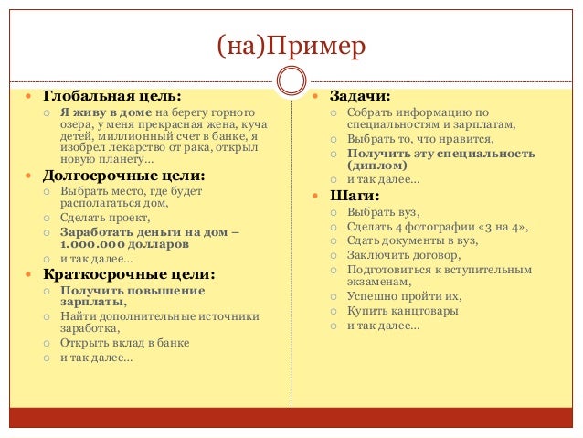 52. 52. (на)Пример  Глобальная цель:  Я живу в доме на берегу горного озера, у меня прекрасная жена, куча детей, миллионный счет в банке, я изобрел лекарство от рака, открыл новую планету…  Долгосрочные цели:  Выбрать место, где будет располагаться дом,  Сделать проект,  Заработать деньги на дом – 1.000.000 долларов  и так далее…  Краткосрочные цели:  Получить повышение зарплаты,  Найти дополнительные источники заработка,  Открыть вклад в банке  и так далее…  Задачи:  Собрать информацию по специальностям и зарплатам,  Выбрать то, что нравится,  Получить эту специальность (диплом)  и так далее…  Шаги:  Выбрать вуз,  Сделать 4 фотографии «3 на 4»,  Сдать документы в вуз,  Заключить договор,  Подготовиться к вступительным экзаменам,  Успешно пройти их,  Купить канцтовары  и так далее…