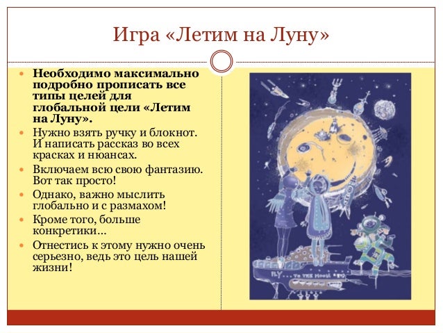 53. 53. Игра «Летим на Луну»  Необходимо максимально подробно прописать все типы целей для глобальной цели «Летим на Луну».  Нужно взять ручку и блокнот. И написать рассказ во всех красках и нюансах.  Включаем всю свою фантазию. Вот так просто!  Однако, важно мыслить глобально и с размахом!  Кроме того, больше конкретики…  Отнестись к этому нужно очень серьезно, ведь это цель нашей жизни!