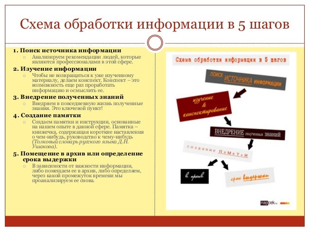 55. 55. Схема обработки информации в 5 шагов 1. Поиск источника информации  Анализируем рекомендации людей, которые являются профессионалами в этой сфере. 2. Изучение информации  Чтобы не возвращаться к уже изученному материалу, делаем конспект. Конспект – это возможность еще раз проработать информацию и осмыслить ее. 3. Внедрение полученных знаний  Внедряем в повседневную жизнь полученные знания. Это ключевой пункт! 4. Создание памятки  Создаем памятки и инструкции, основанные на нашем опыте в данной сфере. Памятка – книжечка, содержащая короткие наставления о чем-нибудь, руководство к чему-нибудь (Толковый словарь русского языка Д.Н. Ушакова). 5. Помещение в архив или определение срока выдержки  В зависимости от важности информации, либо помещаем ее в архив, либо определяем, через какой промежуток времени мы проанализируем ее снова.