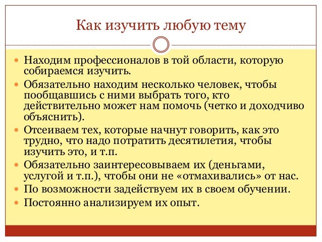 56. 56. Как изучить любую тему  Находим профессионалов в той области, которую собираемся изучить.  Обязательно находим несколько человек, чтобы пообщавшись с ними выбрать того, кто действительно может нам помочь (четко и доходчиво объяснить).  Отсеиваем тех, которые начнут говорить, как это трудно, что надо потратить десятилетия, чтобы изучить это, и т.п.  Обязательно заинтересовываем их (деньгами, услугой и т.п.), чтобы они не «отмахивались» от нас.  По возможности задействуем их в своем обучении.  Постоянно анализируем их опыт.