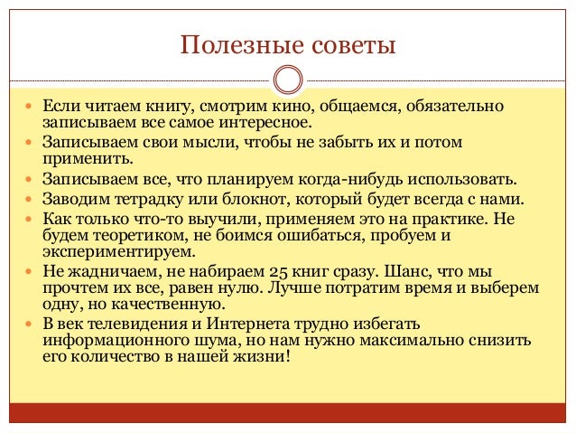 57. 57. Полезные советы  Если читаем книгу, смотрим кино, общаемся, обязательно записываем все самое интересное.  Записываем свои мысли, чтобы не забыть их и потом применить.  Записываем все, что планируем когда-нибудь использовать.  Заводим тетрадку или блокнот, который будет всегда с нами.  Как только что-то выучили, применяем это на практике. Не будем теоретиком, не боимся ошибаться, пробуем и экспериментируем.  Не жадничаем, не набираем 25 книг сразу. Шанс, что мы прочтем их все, равен нулю. Лучше потратим время и выберем одну, но качественную.  В век телевидения и Интернета трудно избегать информационного шума, но нам нужно максимально снизить его количество в нашей жизни!