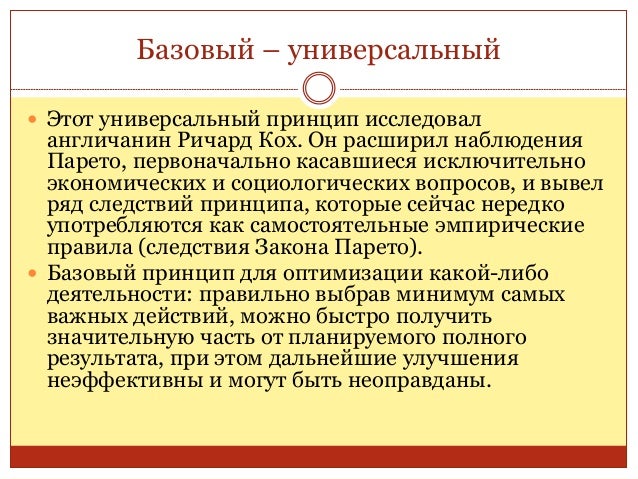 6. 6. Базовый – универсальный  Этот универсальный принцип исследовал англичанин Ричард Кох. Он расширил наблюдения Парето, первоначально касавшиеся исключительно экономических и социологических вопросов, и вывел ряд следствий принципа, которые сейчас нередко употребляются как самостоятельные эмпирические правила (следствия Закона Парето).  Базовый принцип для оптимизации какой-либо деятельности: правильно выбрав минимум самых важных действий, можно быстро получить значительную часть от планируемого полного результата, при этом дальнейшие улучшения неэффективны и могут быть неоправданы.