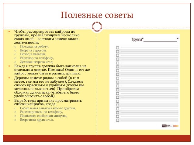61. 61. Полезные советы  Чтобы рассортировать кайросы по группам, проанализируем несколько своих дней – составим список видов деятельности:  Поездка на работу,  Встреча с другом,  Поход в магазин,  Разговор по телефону,  Деловая встреча и т.д.  Каждая группа должна быть записана на отдельном листке. Помним! Один и тот же кайрос может быть в разных группах.  Держим список рядом с собой (в том месте, где мы его не забудем). Сделаем список красивым и удобным (чтобы им хотелось пользоваться). Приобретем обложку для списка (чтобы его было удобно носить с собой).  Выработаем привычку просматривать списки кайросов, когда:  Собираемся заняться чем-то другим,  Разговариваем по телефону,  Появилась свободная минутка,  Встретили друга и т.п.