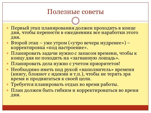63. 63. Полезные советы  Первый этап планирования должен проходить в конце дня, чтобы перенести в ежедневник все наработки этого дня.  Второй этап – уже утром («утро вечера мудренее») – корректировка «под настроение».  Планировать задачи нужно с запасом времени, чтобы к концу дня не походить на «загнанную лошадь».  Планировать дела нужно с учетом приоритетов!  Необходимо иметь под рукой «наполнитель» времени (книгу, блокнот с идеями и т.п.), чтобы не терять зря время и продвигаться к своей цели.  Требуется планировать отдых во время работы.  План должен быть гибким и корректироваться во время дня.