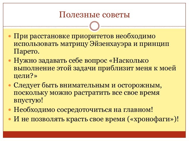 65. 65. Полезные советы  При расстановке приоритетов необходимо использовать матрицу Эйзенхауэра и принцип Парето.  Нужно задавать себе вопрос «Насколько выполнение этой задачи приблизит меня к моей цели?»  Следует быть внимательным и осторожным, поскольку можно растратить все свое время впустую!  Необходимо сосредоточиться на главном!  И не позволять красть свое время («хронофаги»)!