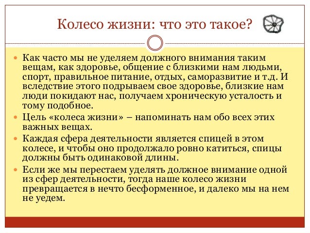 66. 66. Колесо жизни: что это такое?  Как часто мы не уделяем должного внимания таким вещам, как здоровье, общение с близкими нам людьми, спорт, правильное питание, отдых, саморазвитие и т.д. И вследствие этого подрываем свое здоровье, близкие нам люди покидают нас, получаем хроническую усталость и тому подобное.  Цель «колеса жизни» – напоминать нам обо всех этих важных вещах.  Каждая сфера деятельности является спицей в этом колесе, и чтобы оно продолжало ровно катиться, спицы должны быть одинаковой длины.  Если же мы перестаем уделять должное внимание одной из сфер деятельности, тогда наше колесо жизни превращается в нечто бесформенное, и далеко мы на нем не уедем.
