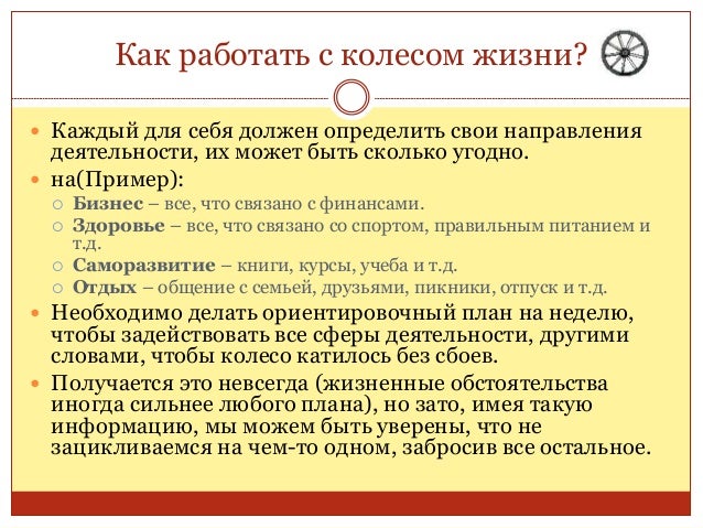 67. 67. Как работать с колесом жизни?  Каждый для себя должен определить свои направления деятельности, их может быть сколько угодно.  на(Пример):  Бизнес – все, что связано с финансами.  Здоровье – все, что связано со спортом, правильным питанием и т.д.  Саморазвитие – книги, курсы, учеба и т.д.  Отдых – общение с семьей, друзьями, пикники, отпуск и т.д.  Необходимо делать ориентировочный план на неделю, чтобы задействовать все сферы деятельности, другими словами, чтобы колесо катилось без сбоев.  Получается это невсегда (жизненные обстоятельства иногда сильнее любого плана), но зато, имея такую информацию, мы можем быть уверены, что не зацикливаемся на чем-то одном, забросив все остальное.
