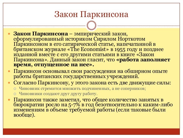 7. 7. Закон Паркинсона  Закон Паркинсона – эмпирический закон, сформулированный историком Сирилом Норткотом Паркинсоном в его сатирической статье, напечатанной в британском журнале «The Economist» в 1955 году и позднее изданной вместе с его другими статьями в книге «Закон Паркинсона». Данный закон гласит, что «работа заполняет время, отпущенное на нее».  Паркинсон основывал свои рассуждения на обширном опыте работы британских государственных учреждений.  Согласно Паркинсону, у этого закона есть две движущие силы:  Чиновник стремится множить подчиненных, а не соперников;  Чиновники создают друг другу работу.  Паркинсон также заметил, что общее количество занятых в бюрократии росло на 5-7% в год безотносительно к каким-либо изменениям в объеме требуемой работы (если таковые были вообще).
