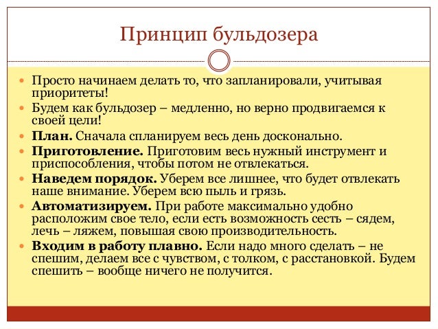 71. 71. Принцип бульдозера  Просто начинаем делать то, что запланировали, учитывая приоритеты!  Будем как бульдозер – медленно, но верно продвигаемся к своей цели!  План. Сначала спланируем весь день досконально.  Приготовление. Приготовим весь нужный инструмент и приспособления, чтобы потом не отвлекаться.  Наведем порядок. Уберем все лишнее, что будет отвлекать наше внимание. Уберем всю пыль и грязь.  Автоматизируем. При работе максимально удобно расположим свое тело, если есть возможность сесть – сядем, лечь – ляжем, повышая свою производительность.  Входим в работу плавно. Если надо много сделать – не спешим, делаем все с чувством, с толком, с расстановкой. Будем спешить – вообще ничего не получится.