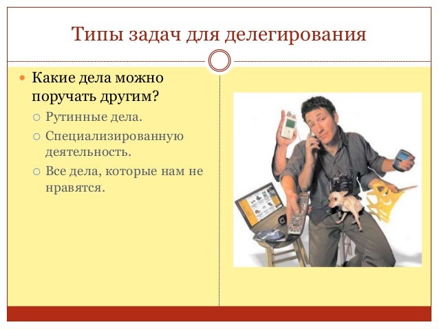 76. 76. Типы задач для делегирования  Какие дела можно поручать другим?  Рутинные дела.  Специализированную деятельность.  Все дела, которые нам не нравятся.