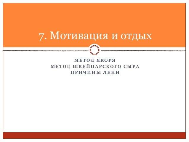 77. 77. М Е Т О Д Я К О Р Я М Е Т О Д Ш В Е Й Ц А Р С К О Г О С Ы Р А П Р И Ч И Н Ы Л Е Н И 7. Мотивация и отдых