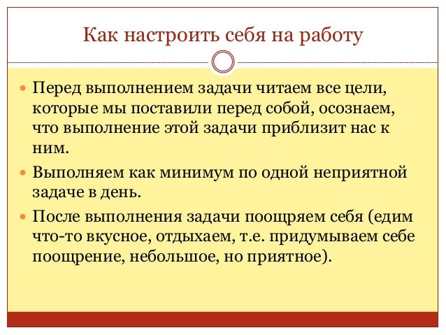 78. 78. Как настроить себя на работу  Перед выполнением задачи читаем все цели, которые мы поставили перед собой, осознаем, что выполнение этой задачи приблизит нас к ним.  Выполняем как минимум по одной неприятной задаче в день.  После выполнения задачи поощряем себя (едим что-то вкусное, отдыхаем, т.е. придумываем себе поощрение, небольшое, но приятное).