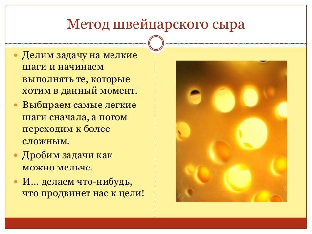 80. 80. Метод швейцарского сыра  Делим задачу на мелкие шаги и начинаем выполнять те, которые хотим в данный момент.  Выбираем самые легкие шаги сначала, а потом переходим к более сложным.  Дробим задачи как можно мельче.  И… делаем что-нибудь, что продвинет нас к цели!