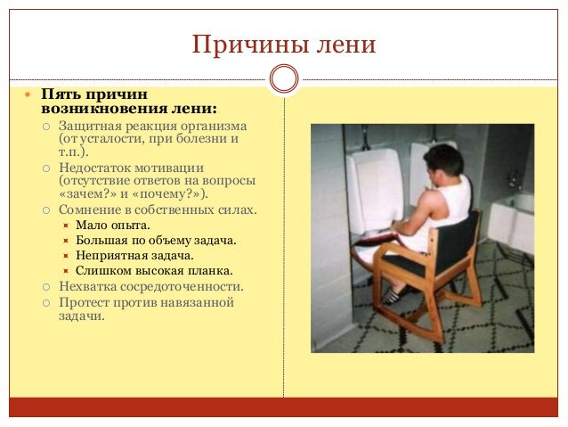 81. 81. Причины лени  Пять причин возникновения лени:  Защитная реакция организма (от усталости, при болезни и т.п.).  Недостаток мотивации (отсутствие ответов на вопросы «зачем?» и «почему?»).  Сомнение в собственных силах.  Мало опыта.  Большая по объему задача.  Неприятная задача.  Слишком высокая планка.  Нехватка сосредоточенности.  Протест против навязанной задачи.