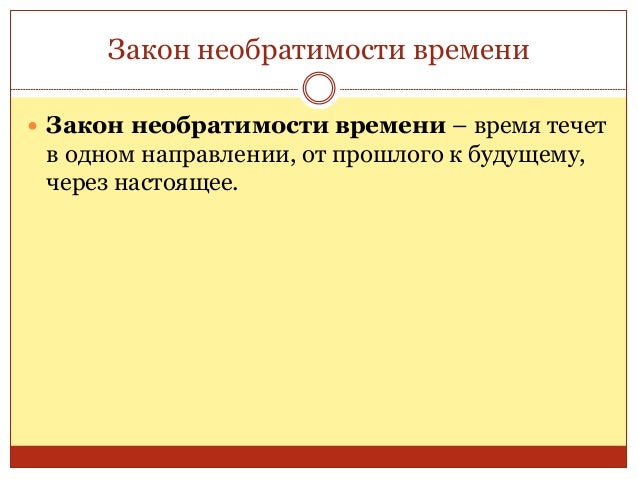 9. 9. Закон необратимости времени  Закон необратимости времени – время течет в одном направлении, от прошлого к будущему, через настоящее.