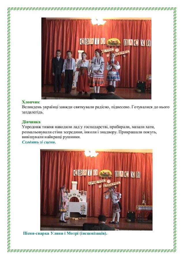 2. 2. Хлопчик Великдень українці завжди святкували радісно, піднесено. Готувалися до нього заздалегідь. Дівчинка Упродовж тижня наводили лад у господарстві, прибирали, мазали хати, розмальовували стіни зсередини, інколи і знадвору. Прикрашали покуть, вивішували найкращі рушники. Сходять зі сцени. Пісня-сварка Уляни і Мотрі (інсценізація).