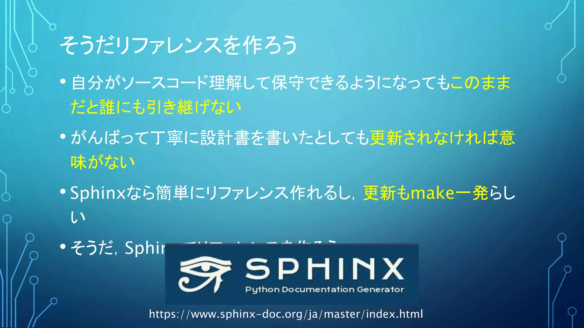 10. 10. そうだリファレンスを作ろう • 自分がソースコード理解して保守できるようになってもこのまま だと誰にも引き継げない • がんばって丁寧に設計書を書いたとしても更新されなければ意 味がない • Sphinxなら簡単にリファレンス作れるし,更新もmake一発らし い • そうだ,Sphinxでリファレンスを作ろう https://www.sphinx-doc.org/ja/master/index.html