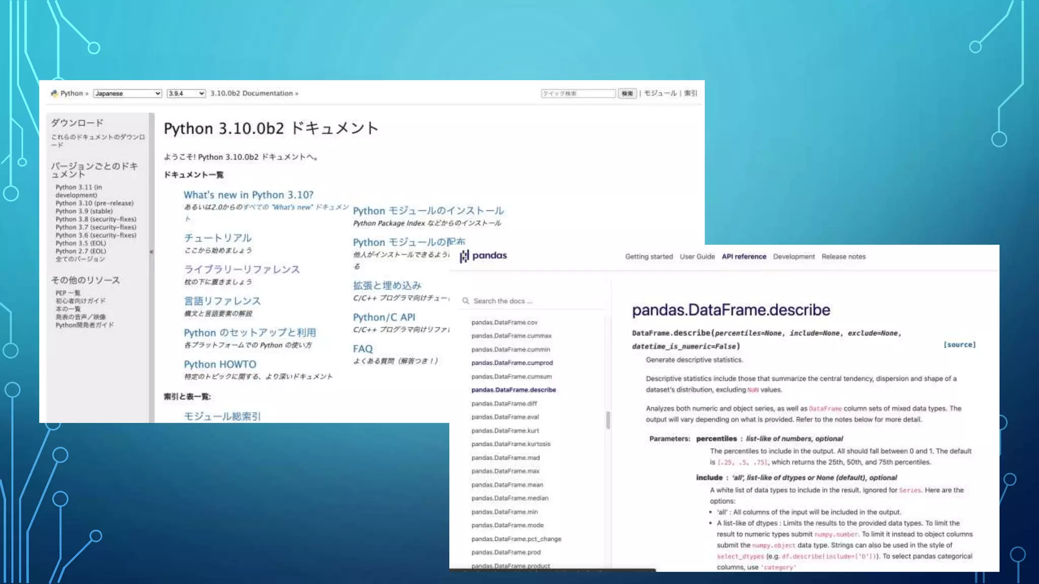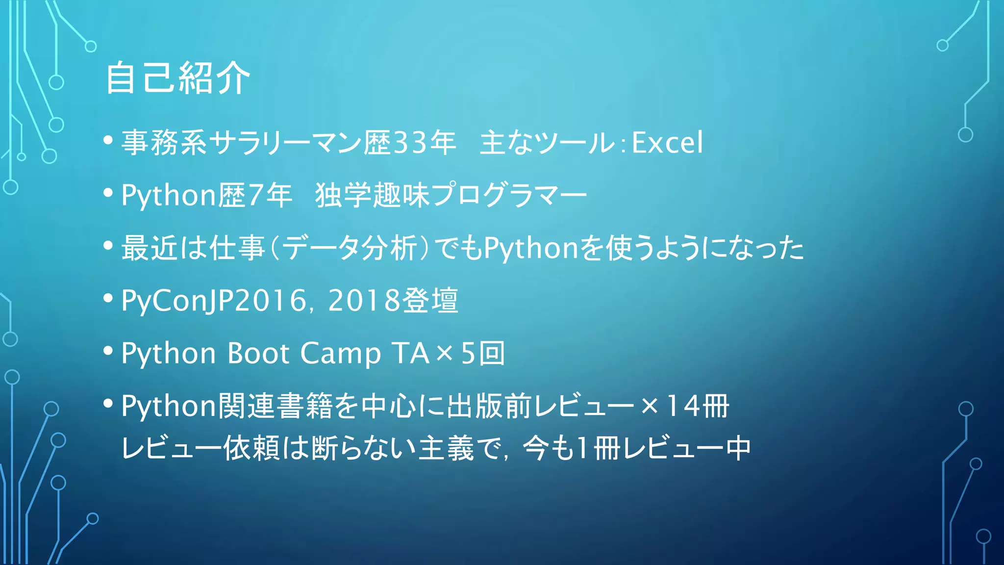 2. 2. 自己紹介 • 事務系サラリーマン歴33年 主なツール:Excel • Python歴7年 独学趣味プログラマー • 最近は仕事(データ分析)でもPythonを使うようになった • PyConJP2016,2018登壇 • Python Boot Camp TA×5回 • Python関連書籍を中心に出版前レビュー×14冊 レビュー依頼は断らない主義で,今も1冊レビュー中