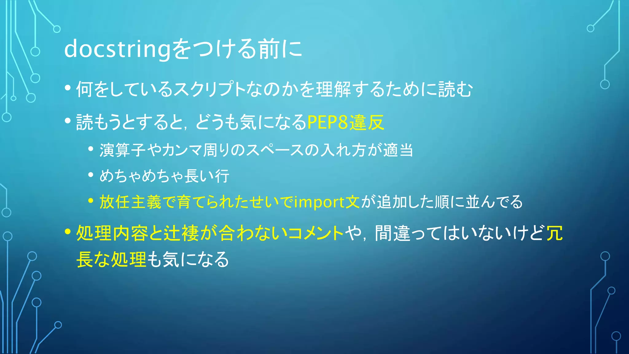 11. 11. docstringをつける前に • 何をしているスクリプトなのかを理解するために読む • 読もうとすると,どうも気になるPEP8違反 • 演算子やカンマ周りのスペースの入れ方が適当 • めちゃめちゃ長い行 • 放任主義で育てられたせいでimport文が追加した順に並んでる • 処理内容と辻褄が合わないコメントや,間違ってはいないけど冗 長な処理も気になる