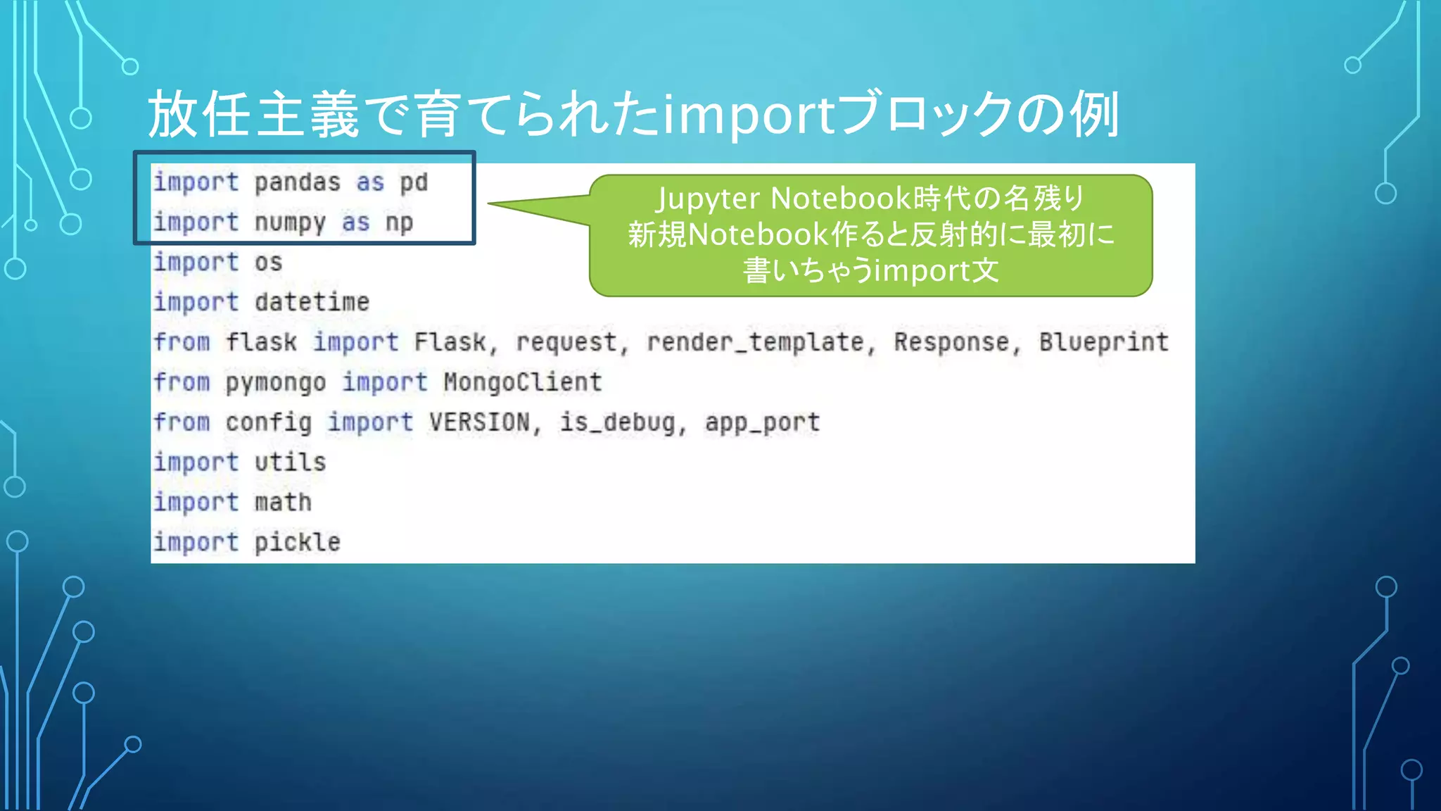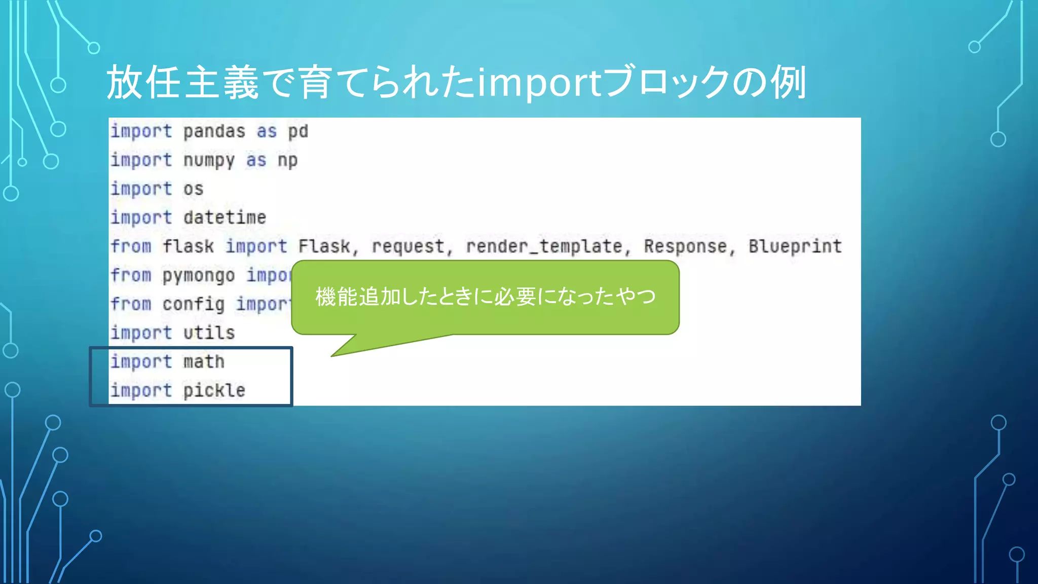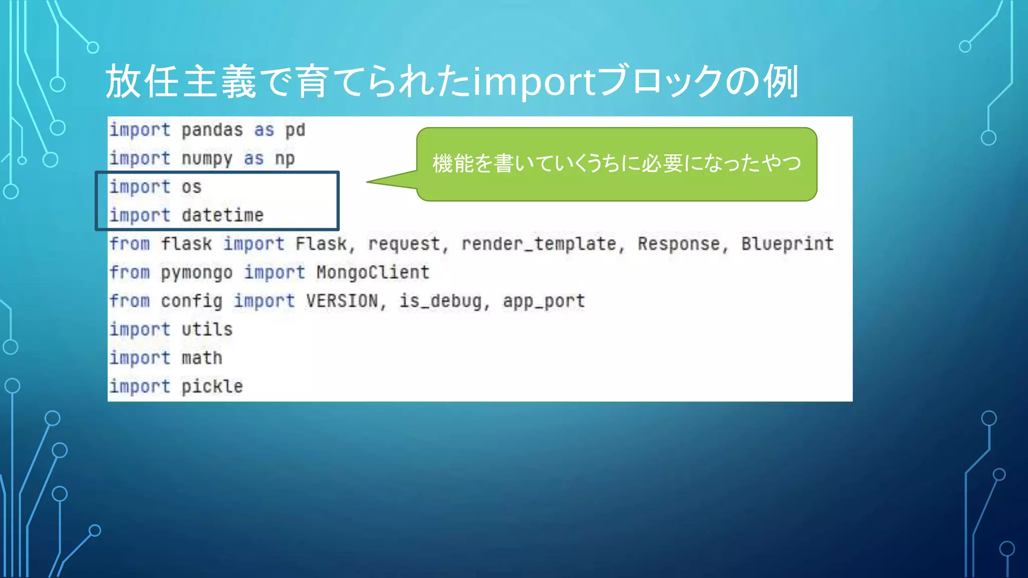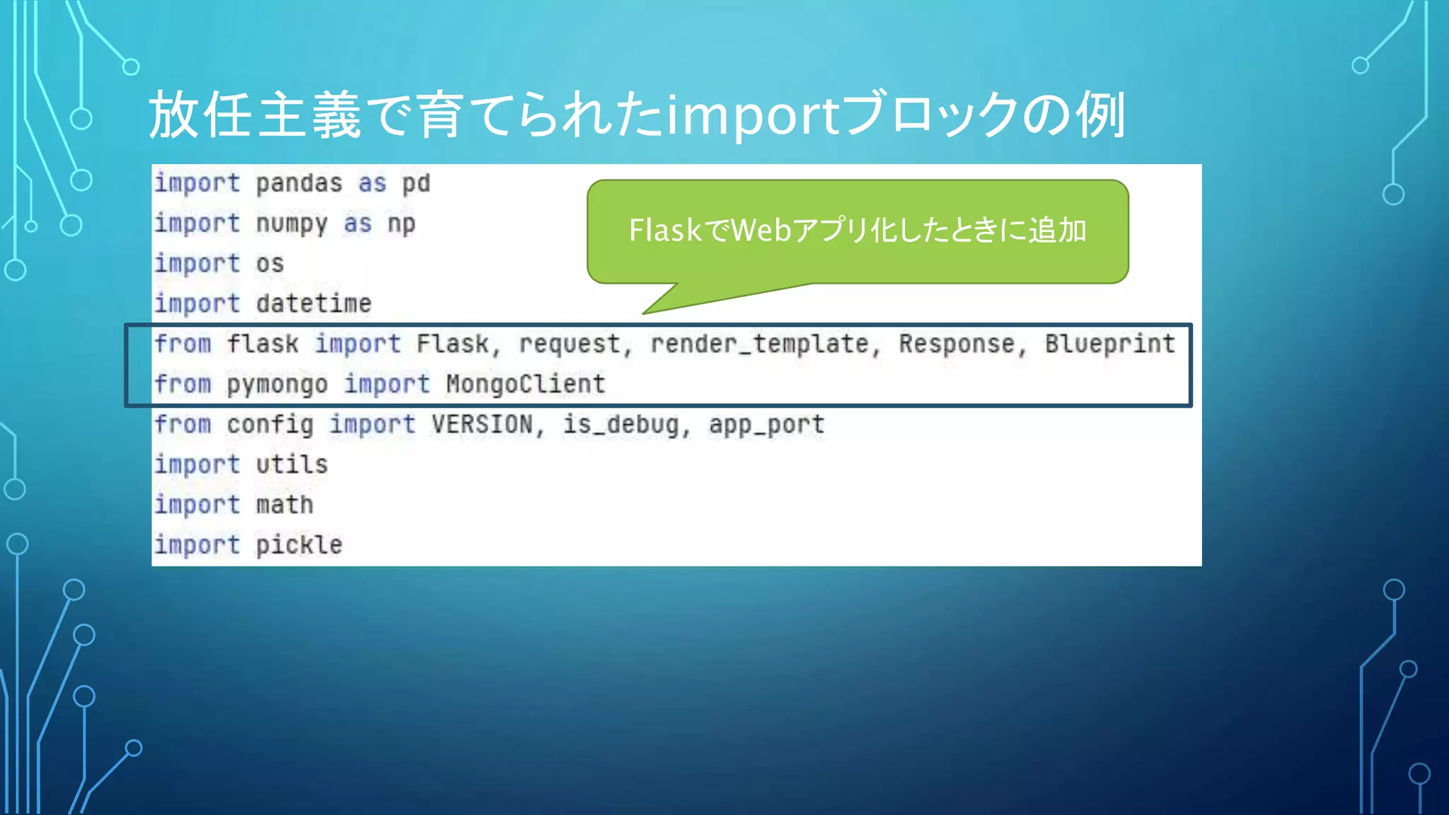 15. 15. 放任主義で育てられたimportブロックの例 FlaskでWebアプリ化したときに追加