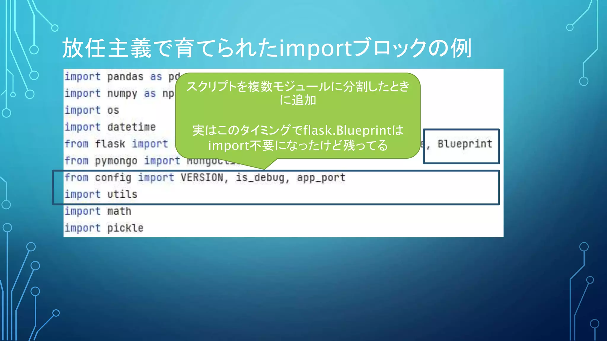16. 16. 放任主義で育てられたimportブロックの例 スクリプトを複数モジュールに分割したとき に追加 実はこのタイミングでflask.Blueprintは import不要になったけど残ってる