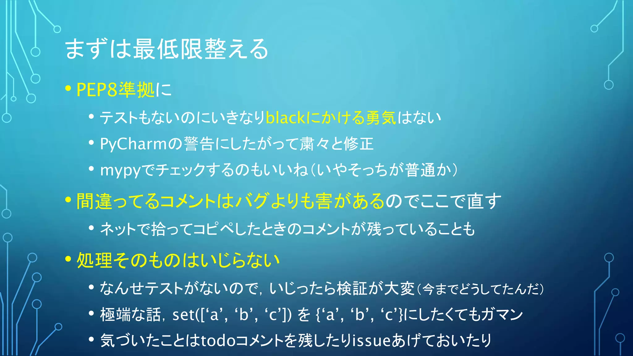 18. 18. まずは最低限整える • PEP8準拠に • テストもないのにいきなりblackにかける勇気はない • PyCharmの警告にしたがって粛々と修正 • mypyでチェックするのもいいね(いやそっちが普通か) • 間違ってるコメントはバグよりも害があるのでここで直す • ネットで拾ってコピペしたときのコメントが残っていることも • 処理そのものはいじらない • なんせテストがないので,いじったら検証が大変(今までどうしてたんだ) • 極端な話,set([‘a’, ‘b’, ‘c’]) を {‘a’, ‘b’, ‘c’}にしたくてもガマン • 気づいたことはtodoコメントを残したりissueあげておいたり
