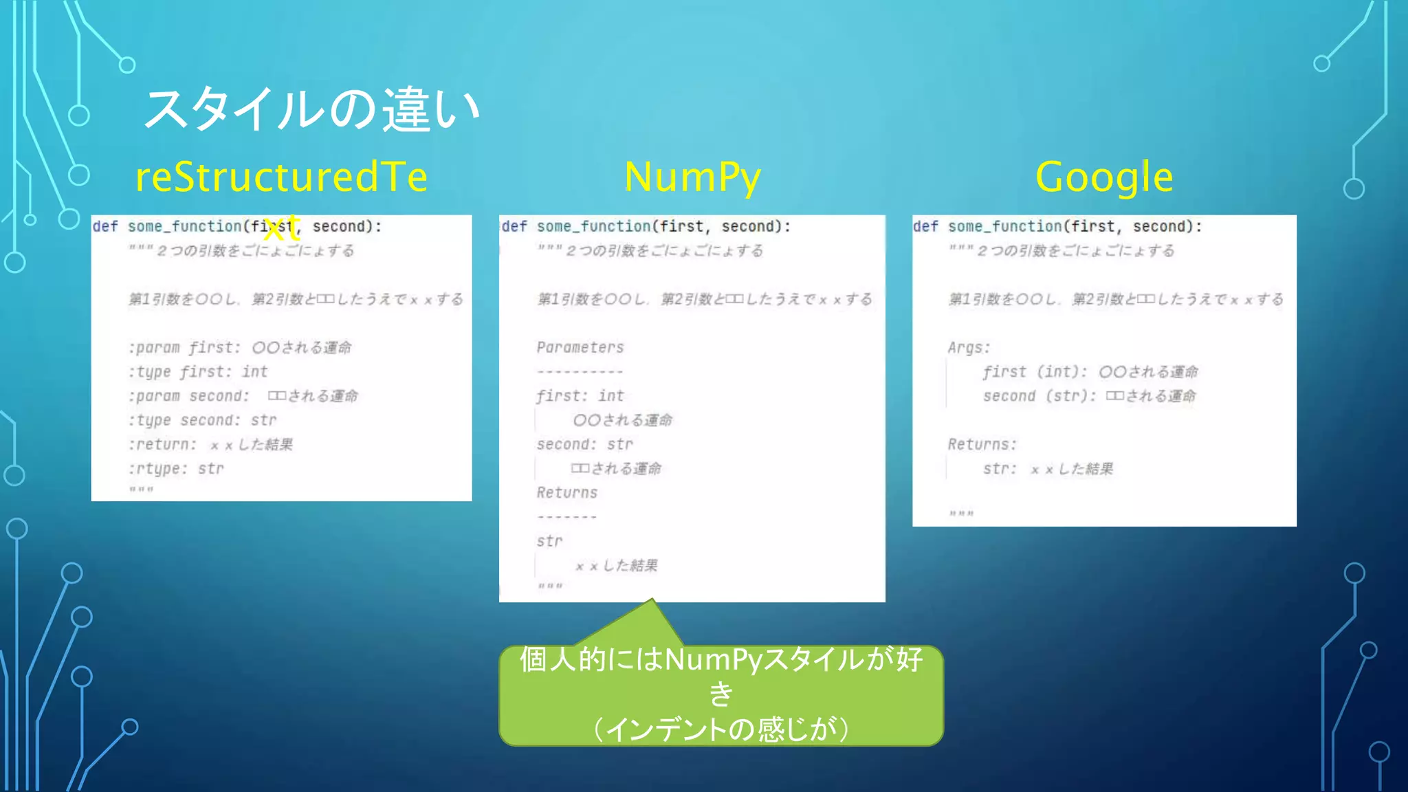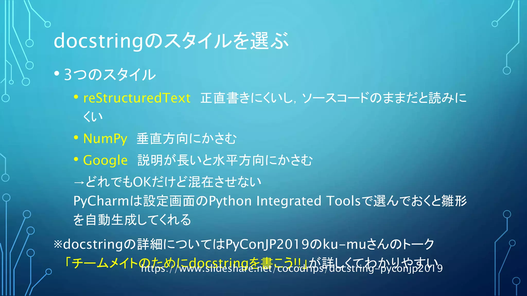 19. 19. docstringのスタイルを選ぶ • 3つのスタイル • reStructuredText 正直書きにくいし,ソースコードのままだと読みに くい • NumPy 垂直方向にかさむ • Google 説明が長いと水平方向にかさむ →どれでもOKだけど混在させない PyCharmは設定画面のPython Integrated Toolsで選んでおくと雛形 を自動生成してくれる ※docstringの詳細についてはPyConJP2019のku-muさんのトーク 「チームメイトのためにdocstringを書こう!!」が詳しくてわかりやすい https://www.slideshare.net/cocodrips/docstring-pyconjp2019