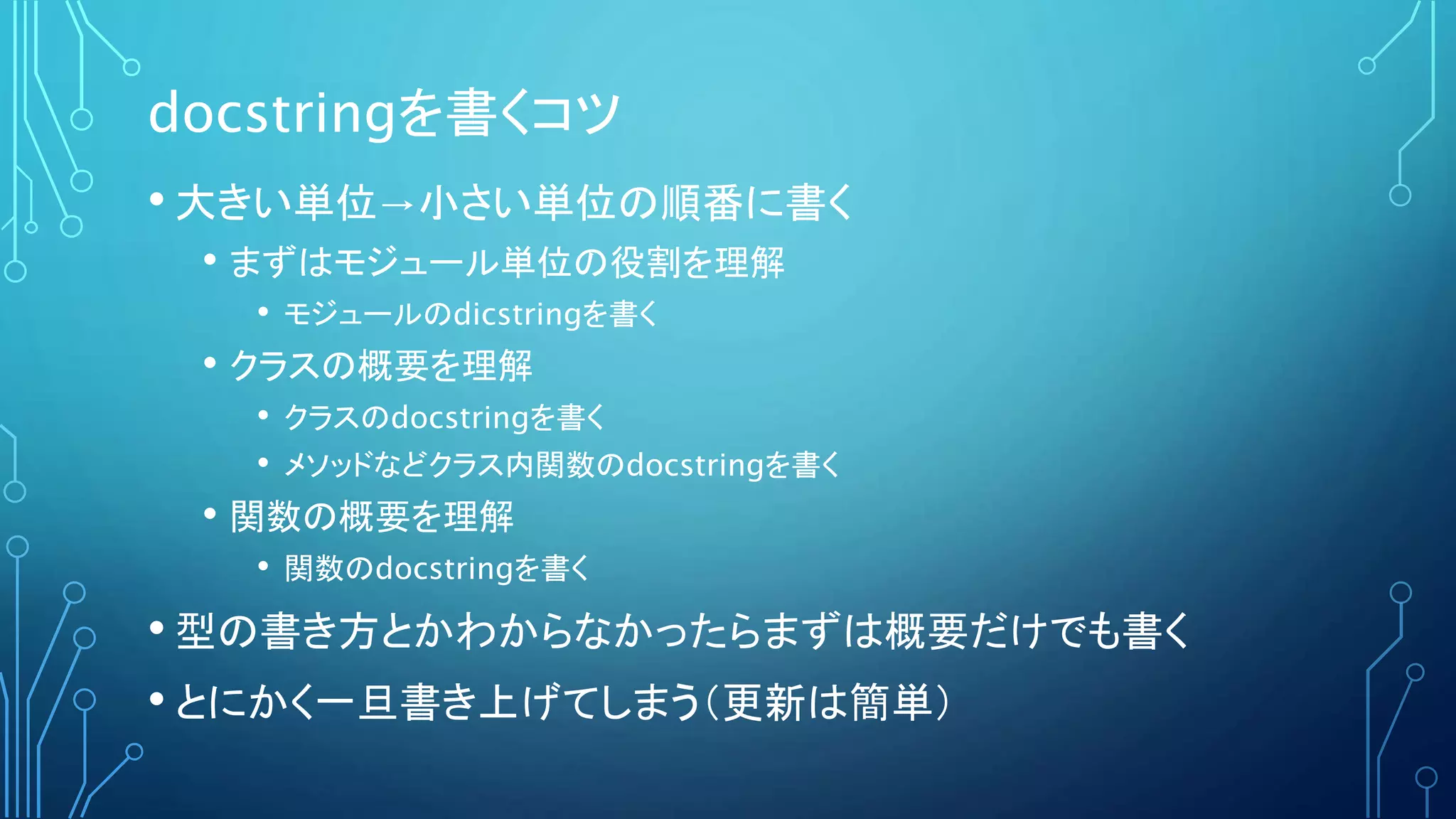 22. 22. docstringを書くコツ • 大きい単位→小さい単位の順番に書く • まずはモジュール単位の役割を理解 • モジュールのdicstringを書く • クラスの概要を理解 • クラスのdocstringを書く • メソッドなどクラス内関数のdocstringを書く • 関数の概要を理解 • 関数のdocstringを書く • 型の書き方とかわからなかったらまずは概要だけでも書く • とにかく一旦書き上げてしまう(更新は簡単) 結局気合い? でも気合い(勢い)も大事