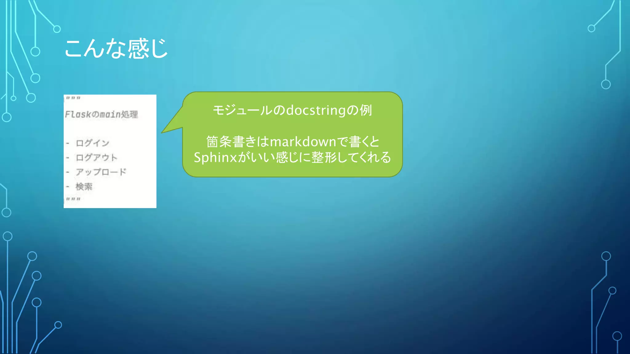 23. 23. こんな感じ モジュールのdocstringの例 箇条書きはmarkdownで書くと Sphinxがいい感じに整形してくれる