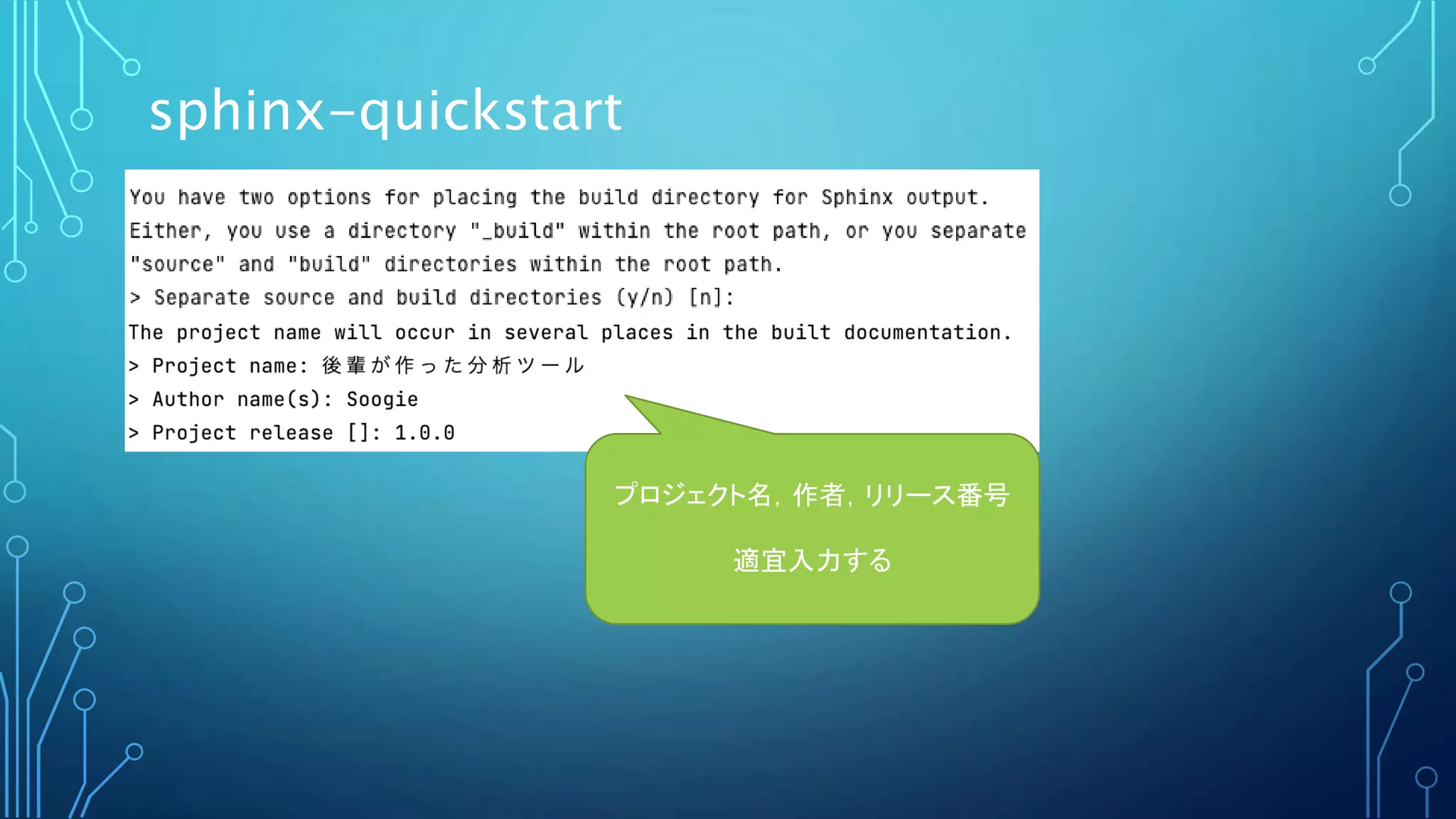 28. 28. sphinx-quickstart プロジェクト名,作者,リリース番号 適宜入力する