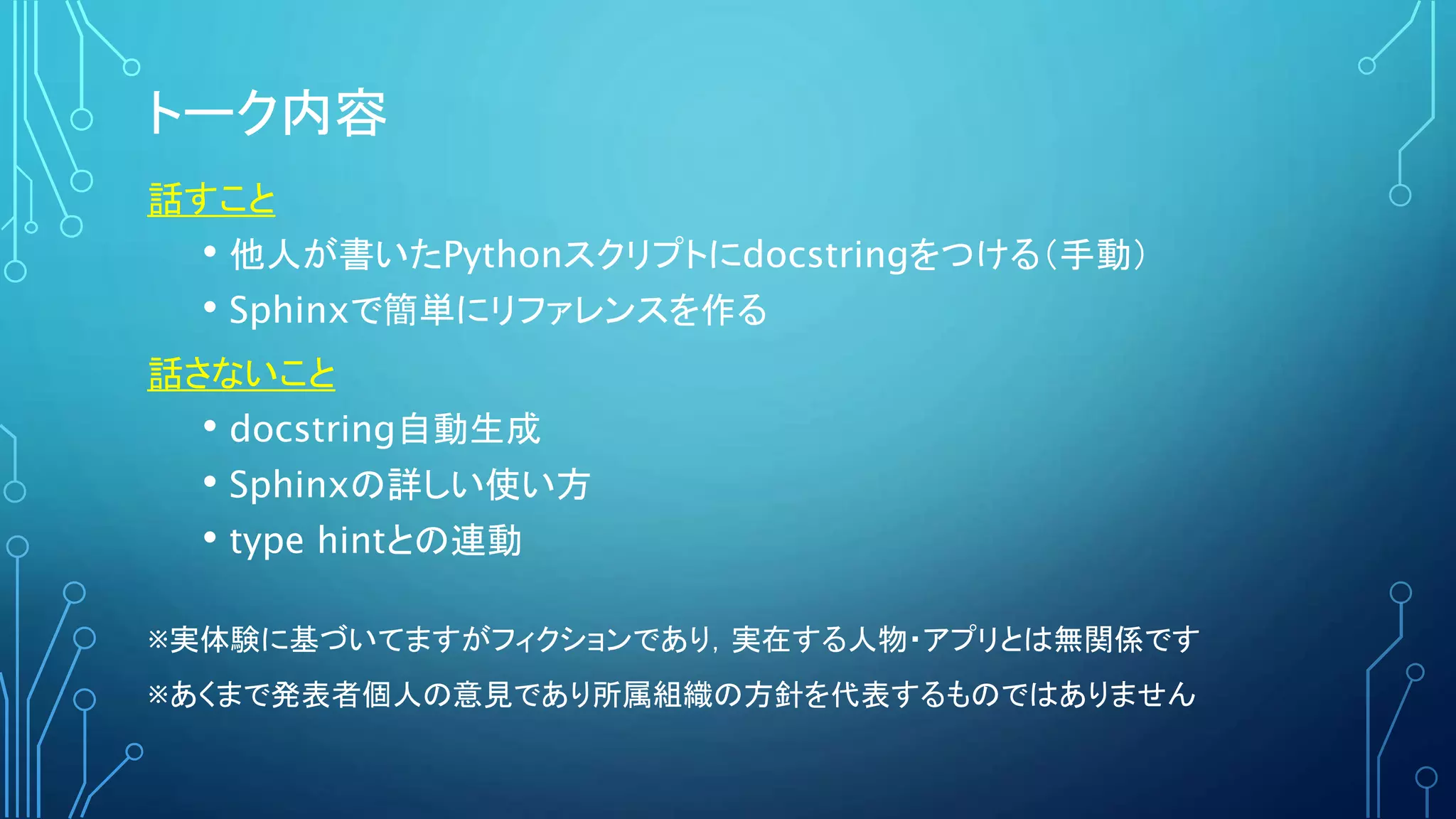 3. 3. トーク内容 話すこと • 他人が書いたPythonスクリプトにdocstringをつける(手動) • Sphinxで簡単にリファレンスを作る 話さないこと • docstring自動生成 • Sphinxの詳しい使い方 • type hintとの連動 ※実体験に基づいてますがフィクションであり,実在する人物・アプリとは無関係です ※あくまで発表者個人の意見であり所属組織の方針を代表するものではありません