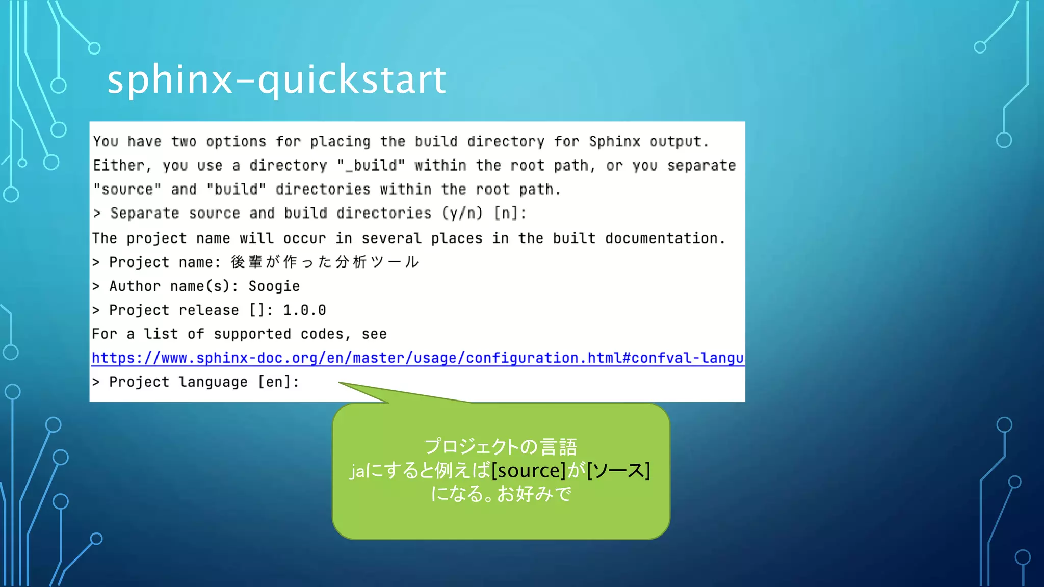 29. 29. sphinx-quickstart プロジェクトの言語 jaにすると例えば[source]が[ソース] になる。お好みで