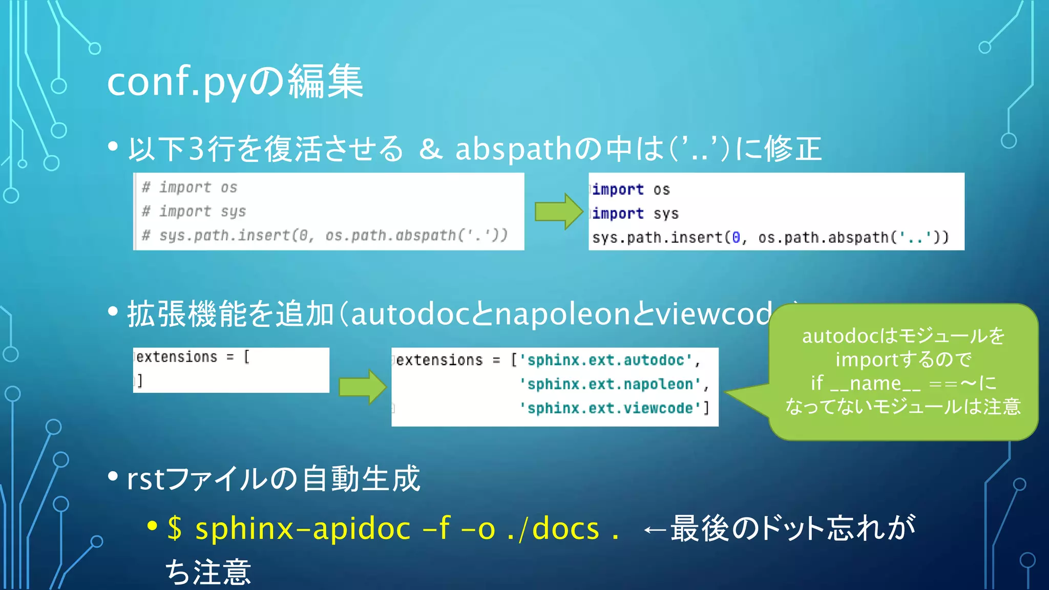 30. 30. conf.pyの編集 • 以下3行を復活させる & abspathの中は(’..’)に修正 • 拡張機能を追加(autodocとnapoleonとviewcode) • rstファイルの自動生成 • $ sphinx-apidoc -f -o ./docs . ←最後のドット忘れが ち注意 autodocはモジュールを importするので if __name__ ==~に なってないモジュールは注意