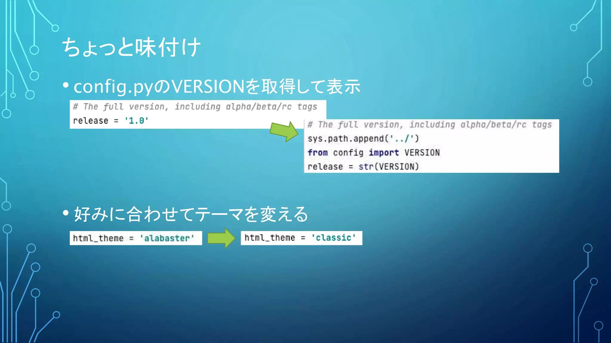 32. 32. ちょっと味付け • config.pyのVERSIONを取得して表示 • 好みに合わせてテーマを変える