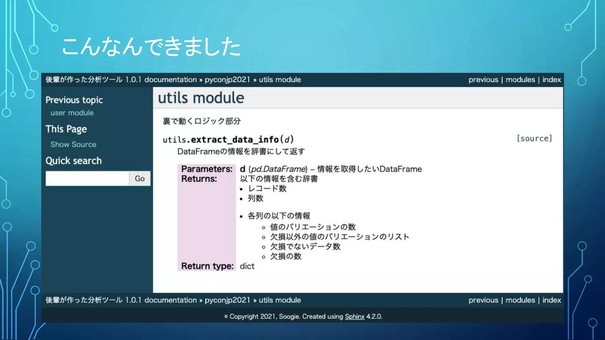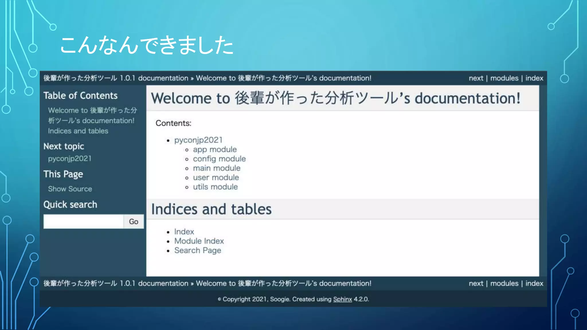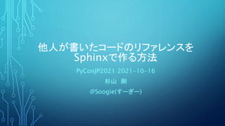1. 1. 他人が書いたコードのリファレンスを Sphinxで作る方法 PyConJP2021 2021-10-16 杉山 剛 @Soogie(すーぎー)